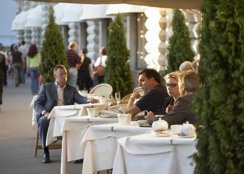 Каждая точка общепита в курсе нашей ментальной террасной слабости. Терраса — это те самые деньги, которые из нас с вами не удается вытащить в течение зимы. Но летом даже самые безнадежные забегаловки получают свое легко и сполна, стоит им только вытащить два стола и поставить их перед входной дверью. Во всем этом уличном поведении присутствует один тонкий психологический момент: как только московский человек садится пить кофе на улице, он автоматически чувствует себя погруженным в воображаемую, нездешнюю роскошь Лазурного берега. И пусть весь мир подождет. Нас с вами в этот момент почти невозможно вывести из себя — как минимум.