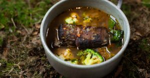 — «Щи с ребрами на медовухе» (890 руб.) — отличный повод расширить свои горизонты по части знакомых с детства щей. Суп из трех видов капусты: брокколи, цветной и обычной белокочанной — томится в печи с говяжьими ребрами. Виноградные листья и сельдерей тут в качестве умной приправы. Взрослая, хорошая еда;