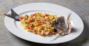 — рыбу с ледника, например дикого сибаса (1100 руб./100 г), могут запечь в соли, приготовить на пару или в печи. Напоминаю, что дикий сибас в нашей акватории — музейная редкость и стоит своих денег;