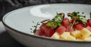 — тартар из тунца с манго (750 руб.) во все стороны благоухает трюфелем. Манго поддерживает это ощущение и дополняет его своим фруктовым сахаром. Жирно-сливочный характер страчателлы каким-то чудом уживается с розовыми кубиками тунца. Признаю, что эта тарелка удачно противоречит принципам сезонности умеренных широт;