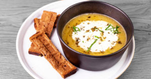 — тостовый белый хлеб к супу художественно оформлен при помощи вафельницы, то есть он в характерную клеточку;