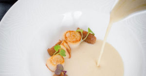 — официант медленно подливает суп из соусника к гребешкам. Кремовая и воздушная субстанция укладывается в тарелку уютным облаком. Корень сельдерея доведен до того волшебного состояния, когда после первой ложки кажется, что ты нашел манну небесную;