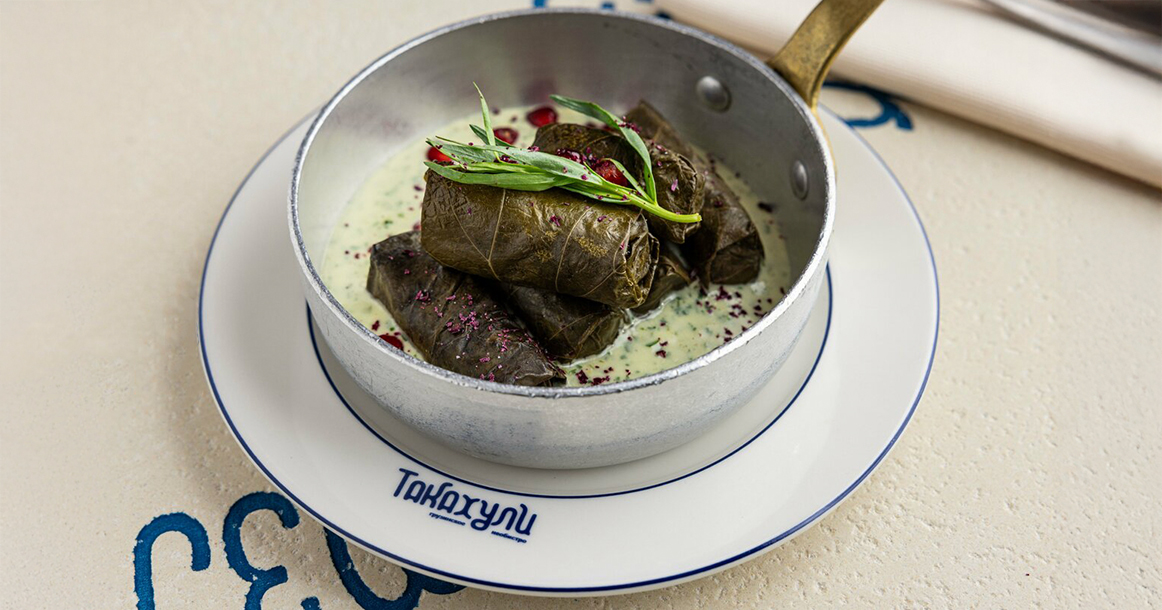 — шелковые свертки долмы (790 руб.) тихонько и аккуратно плещутся в сливочном соусе с эстрагоном и зернами граната. Благородные соки, правильные виноградные листья — все хорошо;