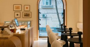 — классные вязаные елки в окне, барашковый диван и стулья в том же духе. Молочно-сливочный интерьер кофейни ментально совпадает с концепт-стором по соседству, в котором даже свечи стоят как чугунный мост;