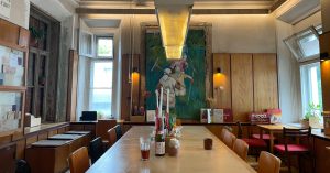 — в одной из комнат устроен паста-бар «Аренда» с завтраками (например, хлопья с молоком стоят 210 руб.). Пол тут в старом линолеуме. Окна с фрамугами. Но музыка бодрая и новая. На открытой кухне розовым неоном написано слово «Люби»;