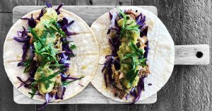 — хрустящая кукурузная лепешка тако карнитас заполнена сочной, томленой, пряной и острой свининой, сдобренной зеленью. Цена одной штуки — 170 руб., парочки — 290 руб.;