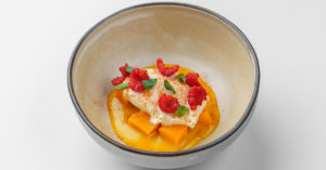 — десерт «Крем-чиз/манго/малина» стоит 450 руб. и своим метафизическим содержанием напоминает классический малиновый чизкейк. Но выглядит все совершенно по-другому и очень просто — как ложка мороженого в желтом соусе и с цветком анютиных глазок на макушке. Мороженого никакого нет — это деликатно сладкий взбитый сливочный сыр. Желтый манговый соус элегантно охлаждает язык. Аккомпанемент ягод малины — спелый, летний акцент.