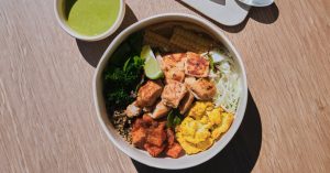 — вместо белка в виде курицы предлагается белок лосося — боул с ним стоит 1290 руб. Но я продолжаю не понимать популярность и ценность искусственно выращенной рыбы, особенно для заявленного здорового питания.