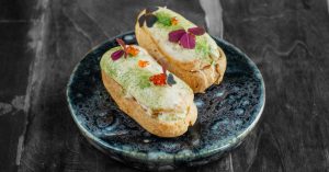 — «Эклеры с крабом» (400 руб.) — не сладкие, а соленые пирожные с красной икрой в качестве украшения. Краб внутри настоящий. За аккуратный внешний вид — твердая пятерка;
