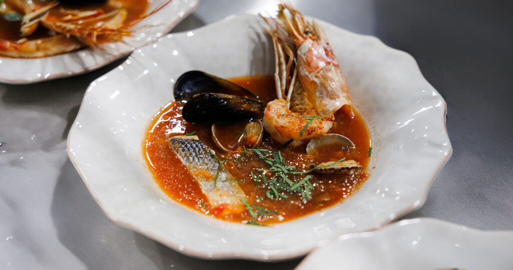 — в исходном, классическом сетуазе, как правило, ничего не плавает. В этом супе важна вкрадчивая, бархатистая текстура без рыбьей кожи и костей, куда положено макать подсушенные куски багета, густо смазанные рыжим соусом руй. Для нашего человека хлеба всегда маловато — это раз, а два — ему нужны визуальные ингредиенты (за упомянутые выше 1190 руб.). Следовательно, в тарелке самозабвенно плещутся ломти рыбы, вонголе и большая креветка.