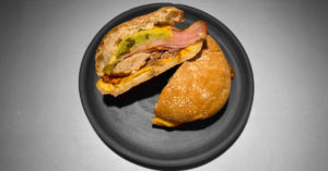 — отличный и сложный вкус у сэндвича с тремя видами свинины (запеченная, томленая и ветчина). Восторженное лаймовое придыхание. Спелый авокадо внутри;