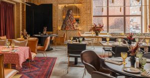 — главный элемент, вокруг которого закручен интерьер — ковер. Арт-объект над столом — ковер. Зеркала с людьми в коврах. Ковры на полу. И все это ради попытки воспроизвести формат домашнего ресторана грузинской кухни, в который хочется приходить при каждом удобном случае;
