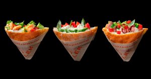 — «кулек» представляет собой булку из дрожжевого теста, разрезанную пополам и упакованную в картонку. Начинка загружена в булку довольно глубоко, и ее достаточно для того, чтобы не кусать, а прямо вилкой доставать какие-нибудь томаты со страчателлой и соусом песто (450 руб.);