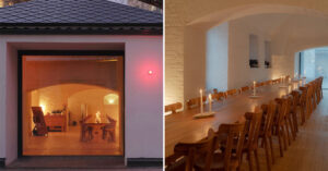 — помещение кузницы XVIII века со сводчатым потолком и кирпичной кладкой. Белый цвет стен и потолка, широкие подоконники-ниши старинных проемов для окон и натуральное дерево мебели. Чистые линии, ничего лишнего;
