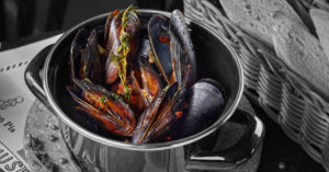— мидии «Мариньер» в сливочном соусе с тимьяном, сельдереем и луком приправлены пивом «Бланш де Флер». В кастрюльке с моллюсками чувствуется правильный морской привкус;