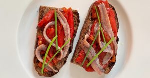 — «Бутерброд с анчоусом» стоит 750 руб., в порции их сразу две шутки. В основе серый тартин, сверху запеченный болгарский перец и филе анчоусов (много). Стрелки зеленого лука ради понятного усиления контраста. Идеальное сочетание сладковатого шелковистого перца и анчоусной умами-сути;