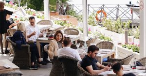 River Club Moscow (Авиационная, 79, корп. 1, стр. 2, ЖК «Алые паруса»). Кафе на набережной ЖК прячется в тени деревьев и зонтов от солнца. На причале — лодки всех мастей, за столами — мужчины, которые спят и видят себя прожженными речными волками. Девушки в шортах составляют им компанию. Все вокруг пытается убедить вас, что море рядом, но это не так. Настроение портит, например, плетеная мебель из пластика и полное отсутствие темперамента пространства. В меню все тот же вечный список московских хитов продаж — с хумусом, форшмаком, бурратой и с салатом с крабом, киноа и авокадо. На гриле могут пожарить скумбрию за 890 руб. Средний чек вьется вокруг отметки 2500 руб. Периодически мимо ресторана пробегают московские серферы, и это тоже отдельное кино.