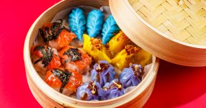 — дим-самы с говядиной, тайским чаем и коллагеновой вытяжкой — темно-синего цвета, но не откровенно страшные. В меню написано, что они «секрет бабушкиной молодости» — это для справки.