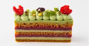 — привлекательный внешний вид веганского десерта: «Фисташковый с малиной» (590 руб.) напоминает пирожное для чаепития с куклами. Зеленые завитушки, малина, разноцветные слои и листики (чуть ли не папоротника) на макушке;