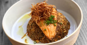 — жареный рис с яйцом, который выдается за компанию с лососем терияки, разварен, в нем слишком много соуса с избытком уксуса (снова!);