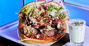 — кебаб подают в открытом виде в большой булке или плотным свертком из лаваша. Овощи в любом случае звонко похрустывают, пряные травы благоухают. Мне нравится приятно острая начинка с кюфтой из ягненка (650 руб.);