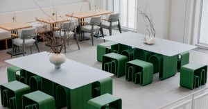 — судя по наблюдениям, публике больше всего нравится первый этаж с белым диваном (его занимают в первую очередь, а во вторую — рассаживаются по зеленым табуретам (из вторичного пластика, распечатаны на 3D-принтере);
