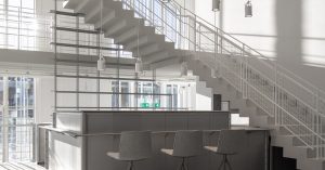 — ресторан расположен на нескольких лестничных пролетах. Непринужденность, минимализм, много воздуха, эпические окна. Все вместе напоминает чистый белый лист, на котором эффектно смотрятся любые арт-объекты;