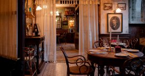 — тесно, но удобно. Винтажная мебель и занавески в кружавках и кисточках висят как надо. Латунные подсвечники, мраморные круглые столешницы и, похоже, потолок специально коптили для достоверности;